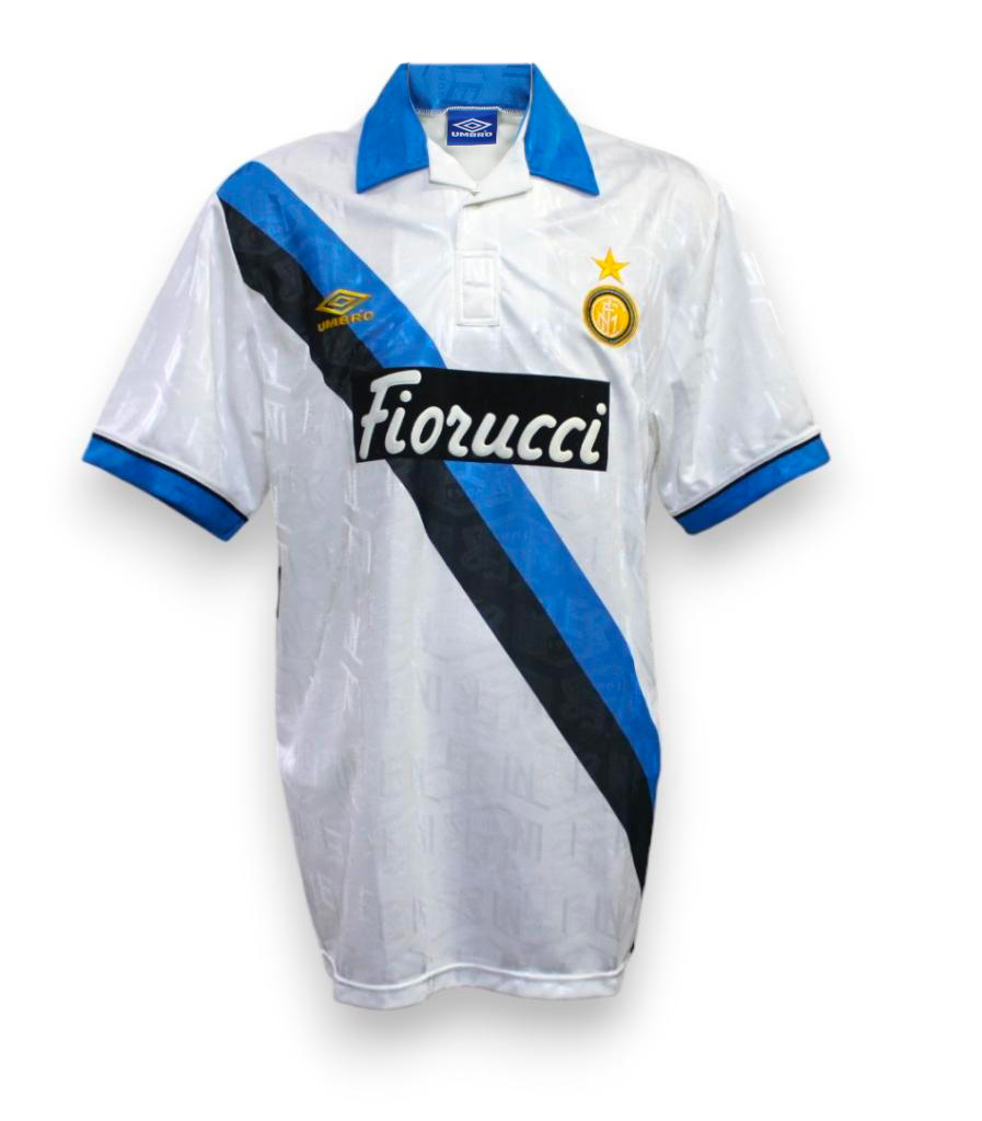 Maglia da trasferta per la stagione 1994-1995 con autografo di Alessandro Bianchi, storico giocatore dell'Inter dal 1988 al 1996, che ha collezionato 179 presenze ufficiali e 9 gol, contribuendo alle vittorie delle Coppa Uefa del 1991 e 1994.