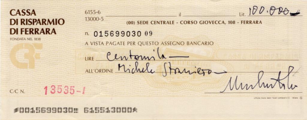 Assegno di Lire 100.000 destinato a Michele Straniero noto cantautore, musicologo e giornalista italiano. Fondatore, a Torino, del gruppo di Cantacronache, viene considerato tra i precursori dell'esperienza diretta dei cantautori italiani.