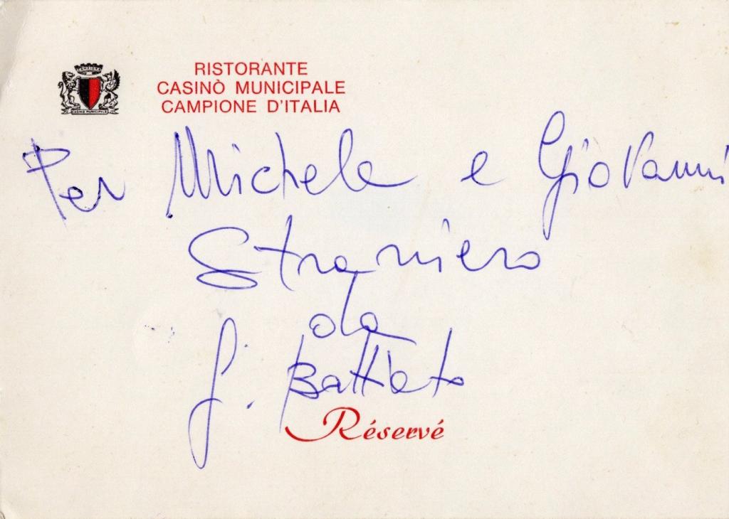 Biglietto su carta intestata del Ristorante Casinò Municipale - Campione d'Italia con dedica interamente autografa e firmata di Franco Battiato: "Per Michele e Giovanni Straniero da F. Battiato".