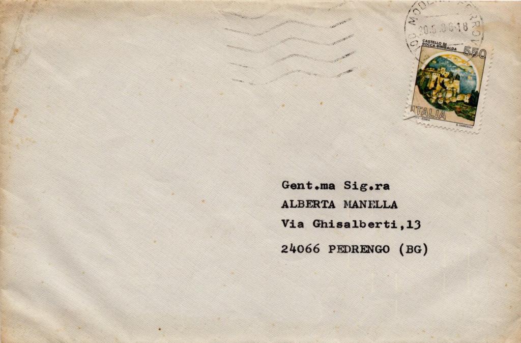 Lettera su carta intestata di Luciano Pavarotti indirizzata ad Alberta Manella e con busta affrancata.