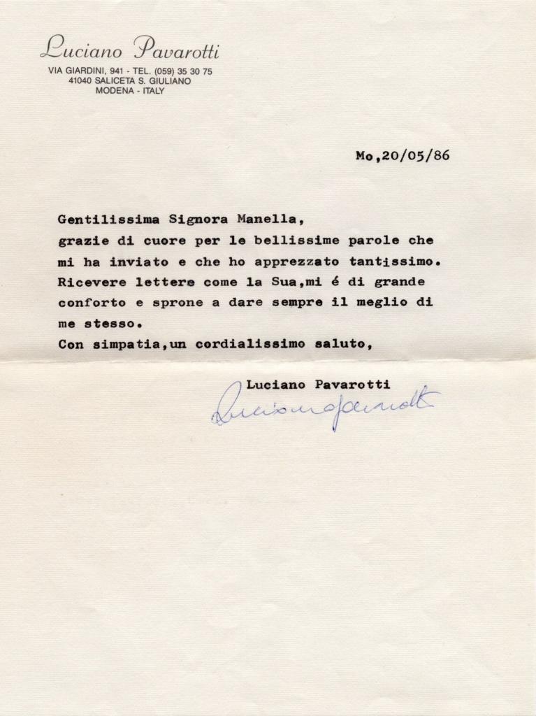 Con la presente lettera dattiloscritta e firmata, il celebre tenore invia un sentito ringraziamento per la lettera che ha ricevuto: "Grazie di cuore per le bellissime parole che mi ha inviato e che ho apprezzato tantissimo. Ricevere lettere come la Sua, mi è di grande conforto e sprone a dare sempre il meglio di me stesso".