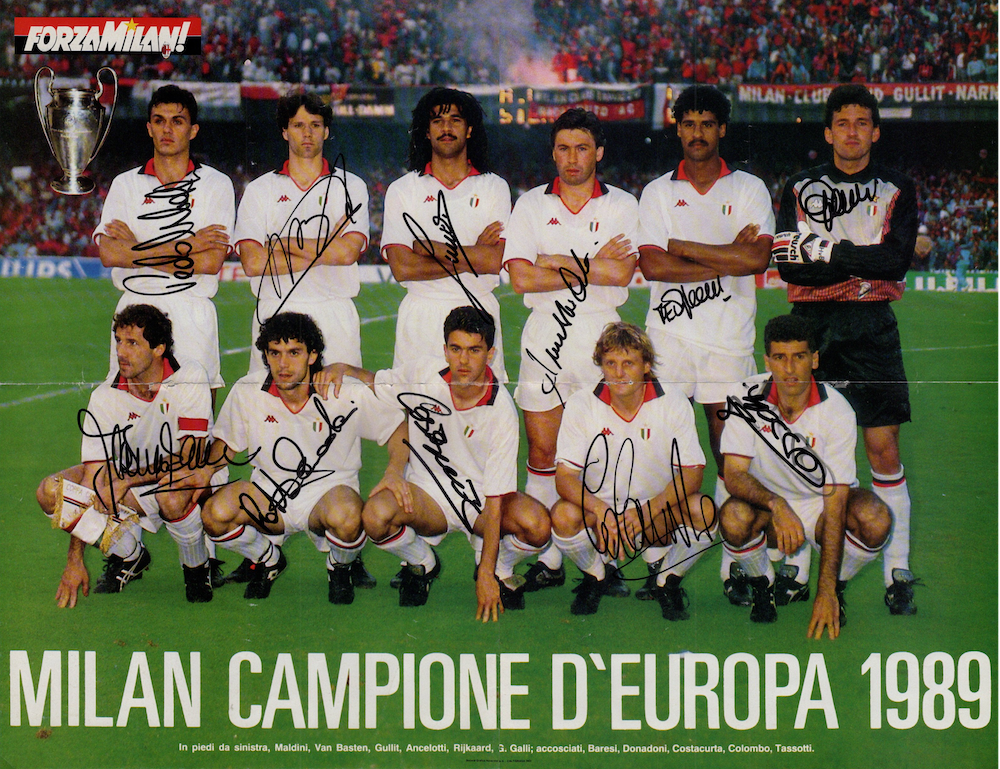 Autografi della formazione titolare della Finale di Coppa dei Campioni 1988-89, che vide l'A.C Milan conquistare il suo terzo titolo europeo.