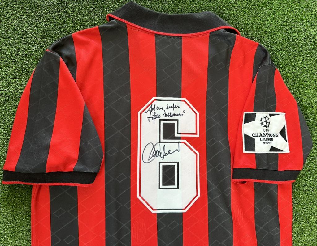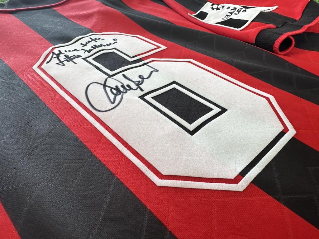 Sulla maglia Franco Baresi ha apposto una dedica: "Ad un super tifoso rossonero".