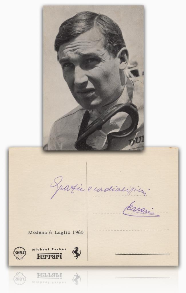 La cartolina riporta sul retro la data e l'autografo del grande imprenditore, mentre sul fronte è presente la fotografia del pilota Michael Parkes "Mike".