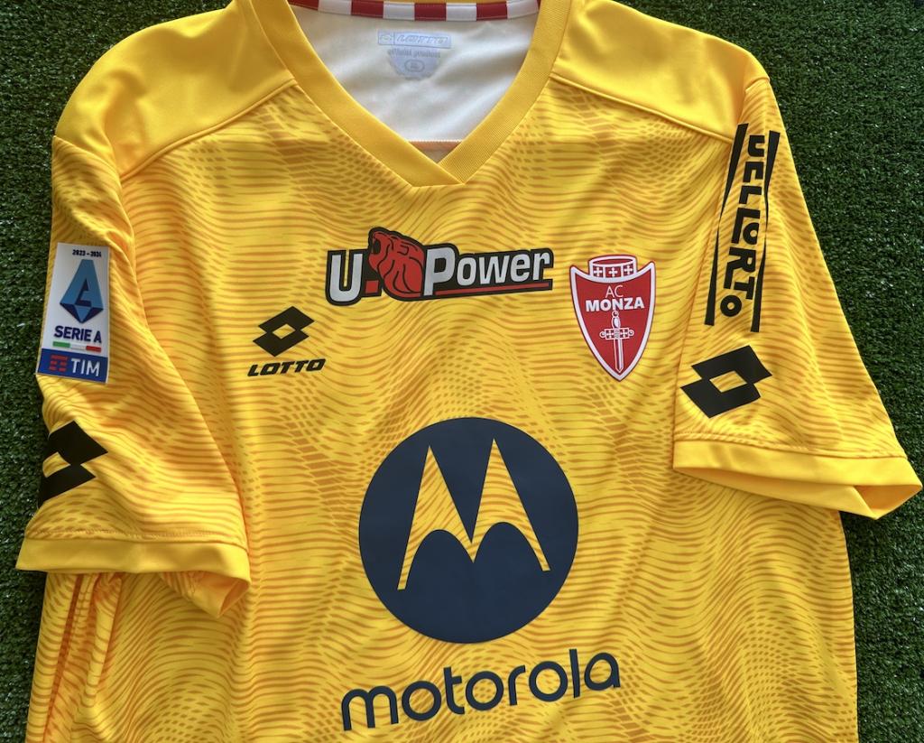Stemma gommato del Monza Calcio sul fronte assieme ai loghi U. Power e Motorola.