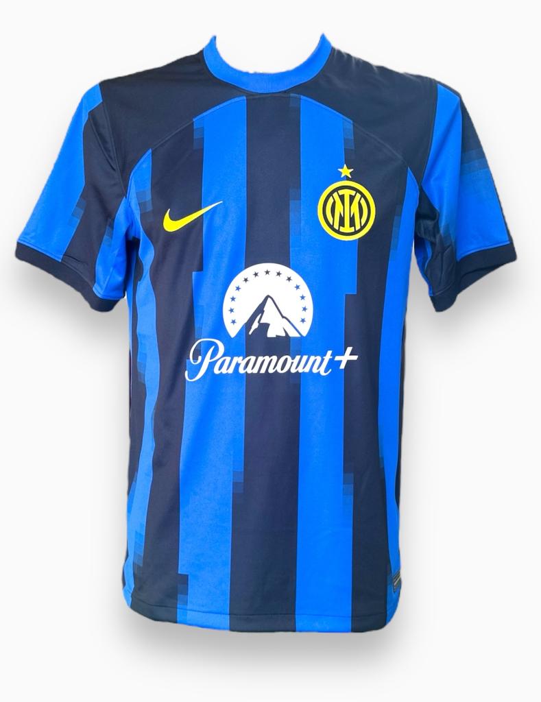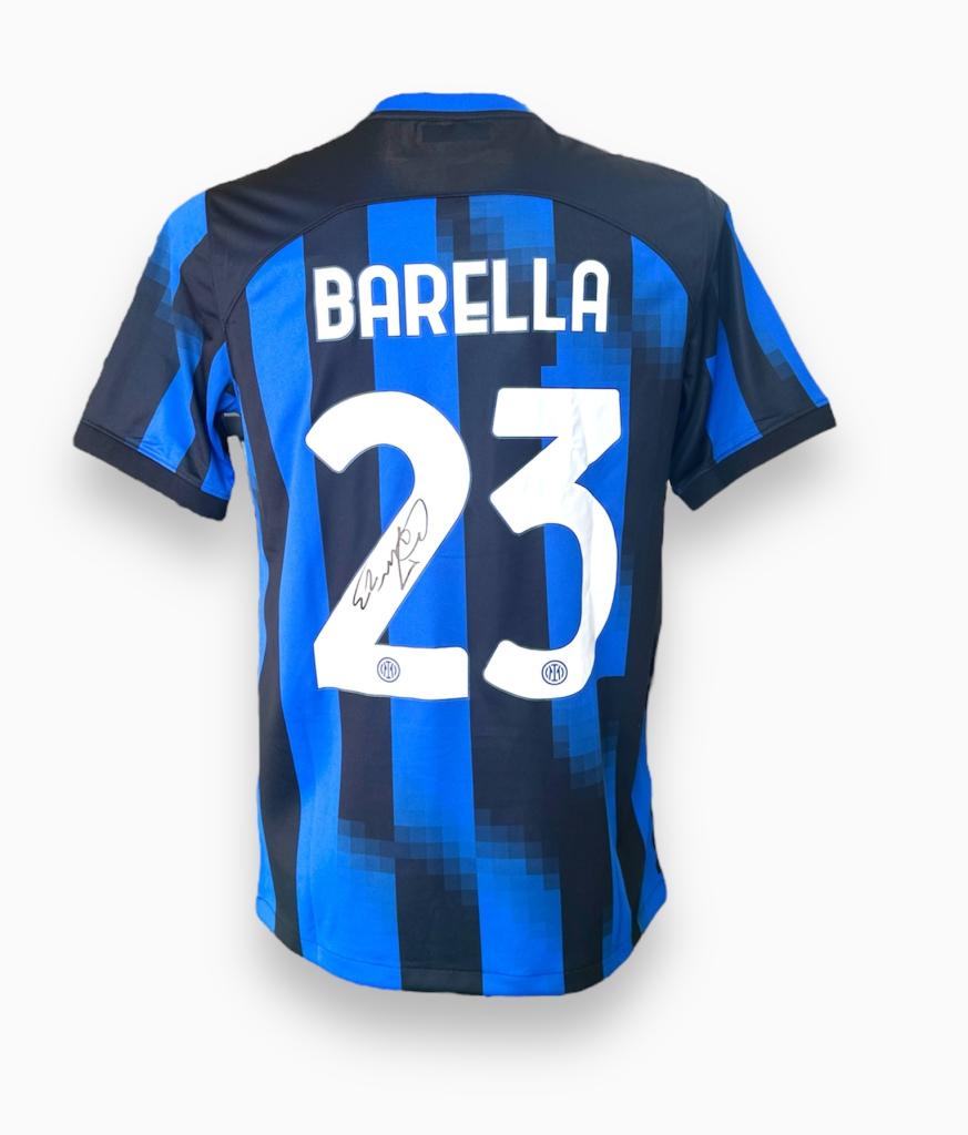 Maglia versione Store del FC Internazionale per l'anno 2023-24 con autografo del centrocampista Nicolò Barella. Barella è un calciatore italiano nato a Cagliari, attualmente centrocampista dell'Inter, di cui è vice-capitano, e della nazionale italiana, con cui si è laureato campione d'Europa nel 2021.