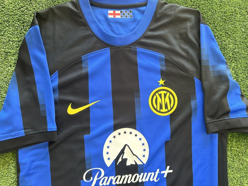 La maglia riporta lo sponsor tecnico "Paramount+" sul fronte unitamente allo stemma dell'Inter e della Nike cuciti in colore oro.