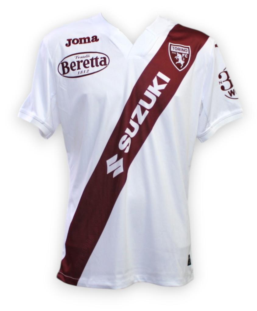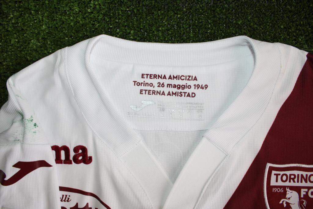 La maglia da trasferta Joma Torino 21-22 rende omaggio agli argentini del River Plate che giocarono un'amichevole benefica contro il Torino dopo il disastro aereo di Superga.