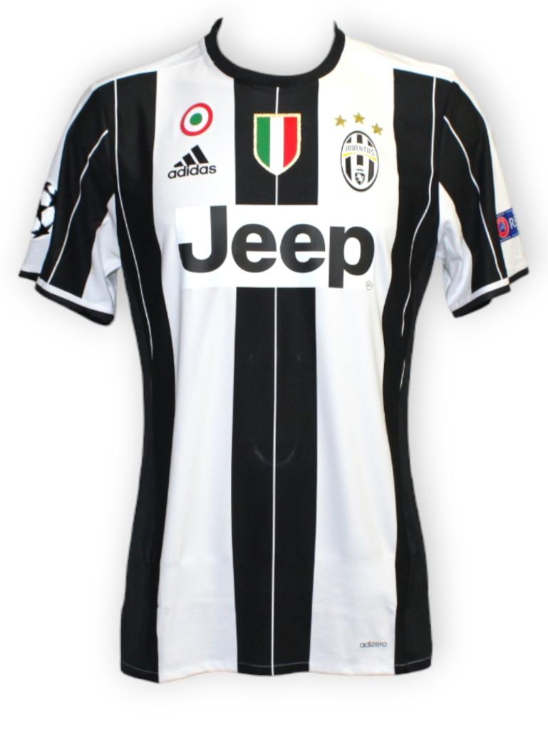 La maglia casalinga della Juventus 2016-17 presenta due strisce bianche e tre nere sul davanti, con queste ultime che includono strisce gessate bianche al centro. Le strisce continuano anche sulle maniche della maglia, mentre le spalle sono colorate di bianco.