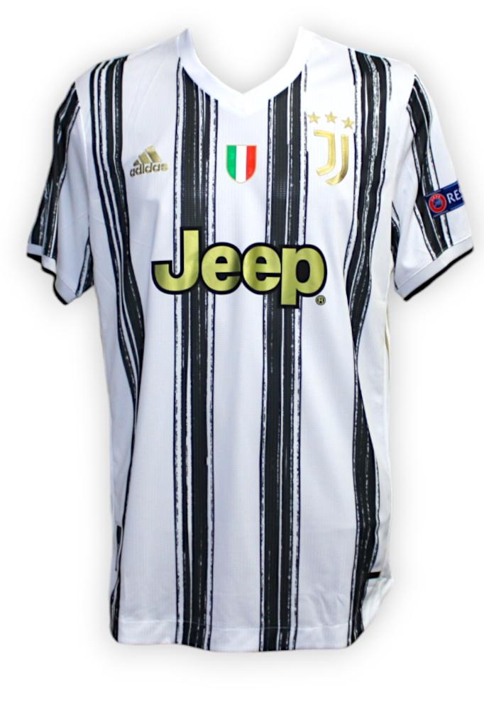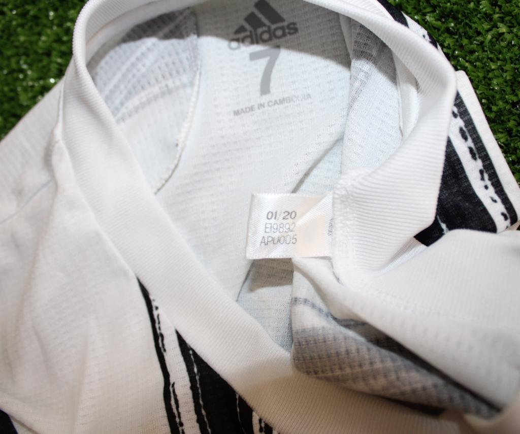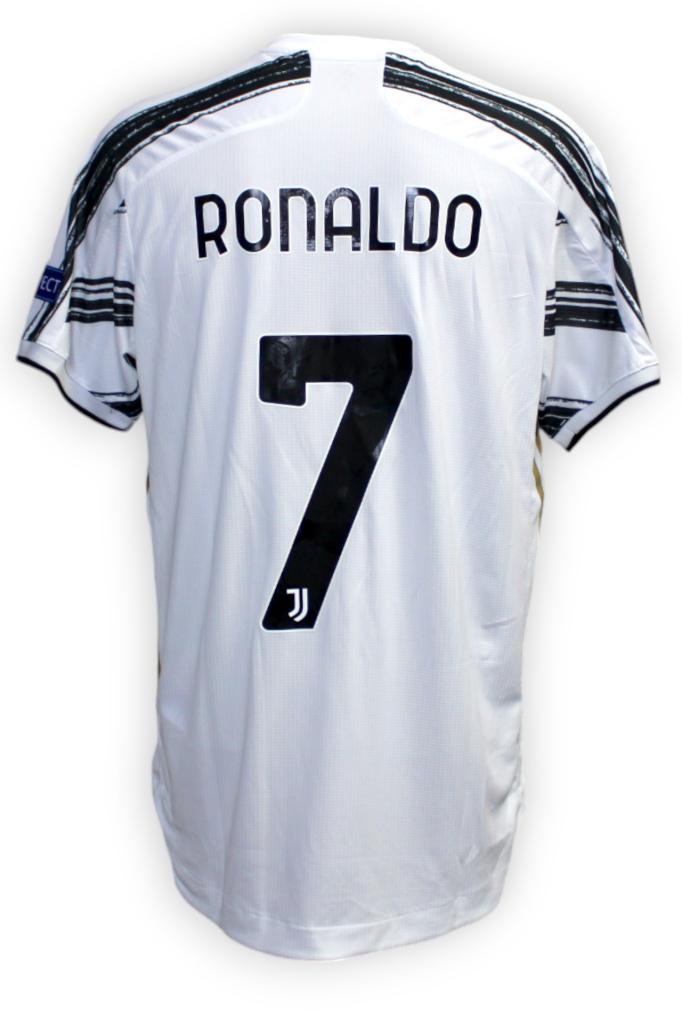 Maglia Player Issued versione Home della Juventus preparata per il calciatore Cristiano Ronaldo per una partita della Champions League della stagione 2020-2021.