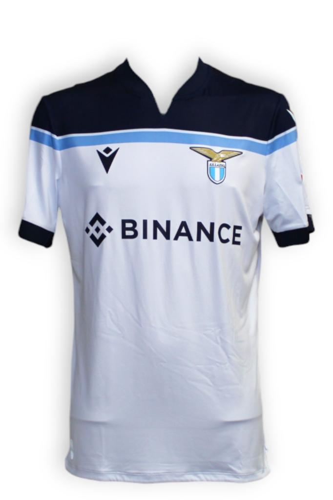 La maglia da trasferta Macron Lazio 2021-2022 è di colore bianco con un carré blu incorniciato da una striscia celeste leggermente sfalsata.