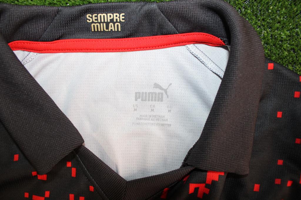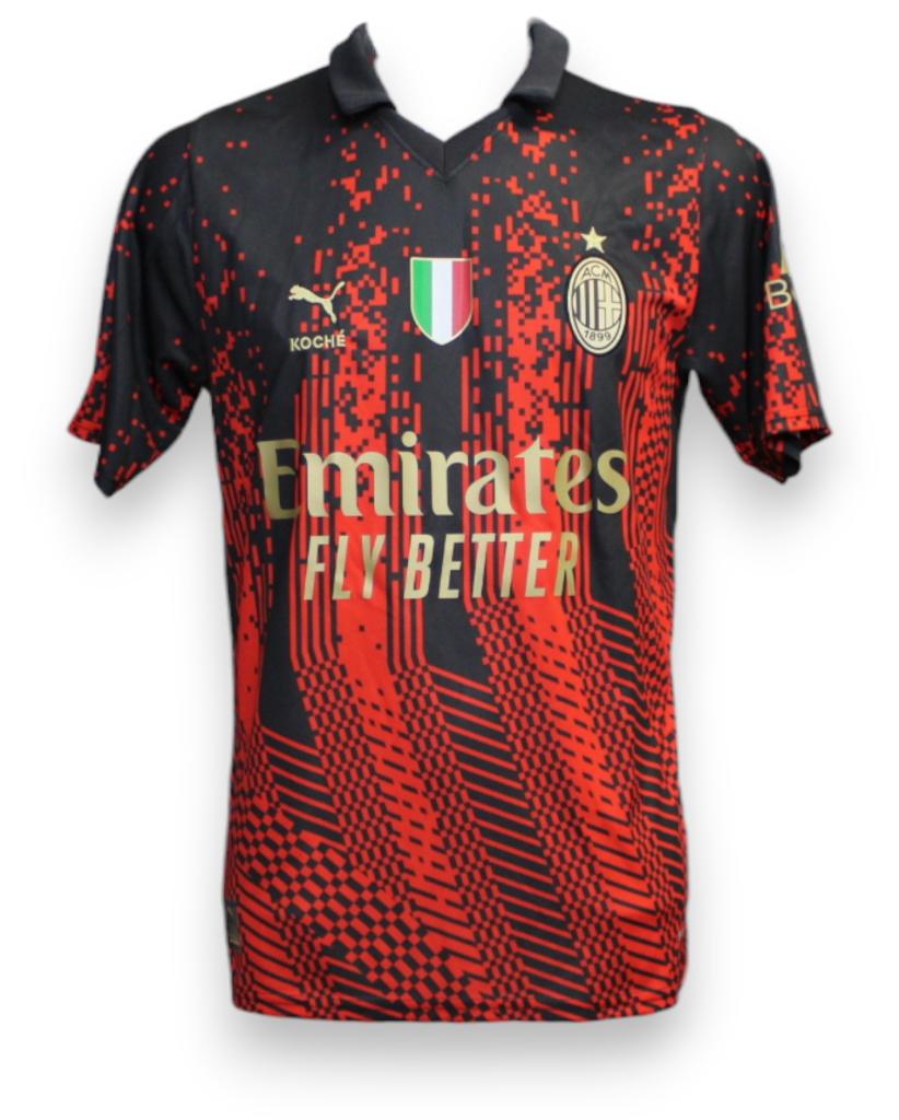 La maglia speciale Puma Koché Milan 2023 vanta un design unico. Le classiche maglie a strisce nere e rosse della squadra sono "reinterpretate in una gloria digitale a 8 bit".