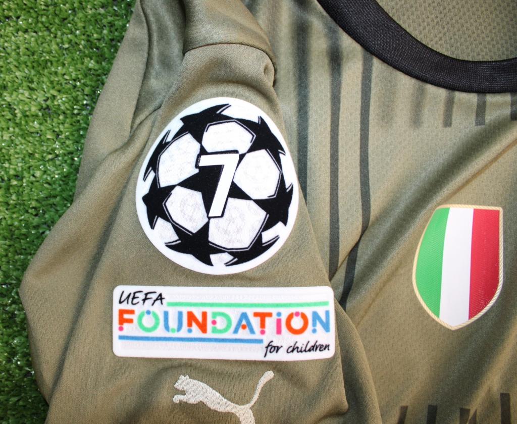 Presenti le patches della Champions League, quella di UEFA Foundation for Children e lo scudetto tricolore commemorativo.