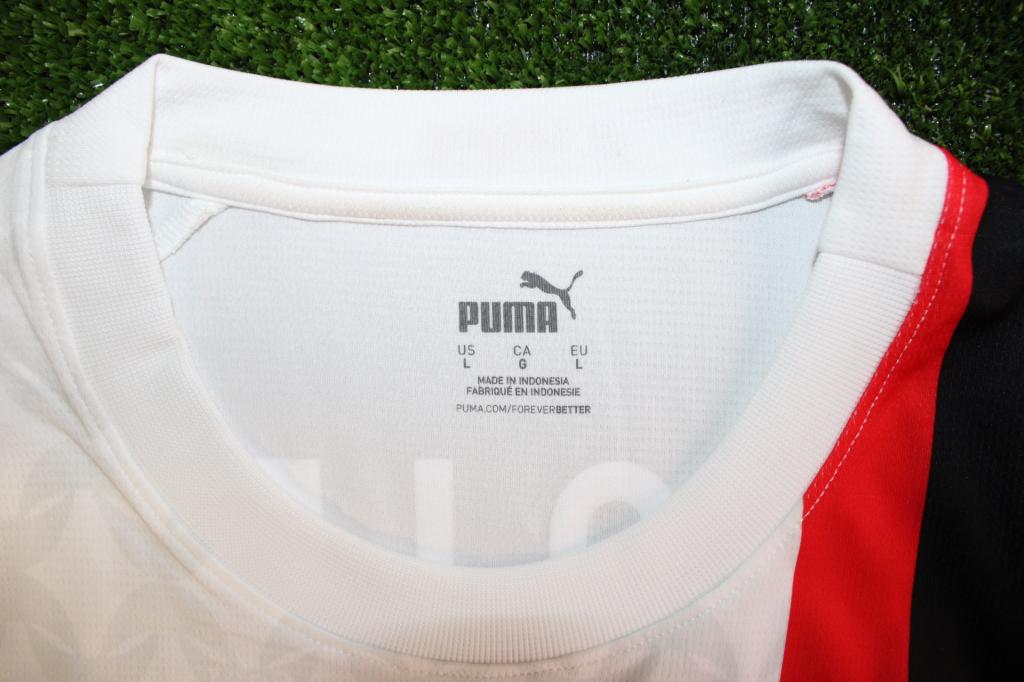 La maglia da trasferta Puma Milan 23-24 presenta un interessante design in bianco, argento scuro, rosso e nero.
