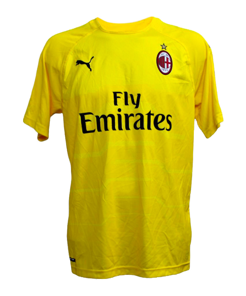 Prima maglia da portiere versione Store del Milan con il nameset del calciatore Gianluigi Donnarumma della stagione 2018-2019.