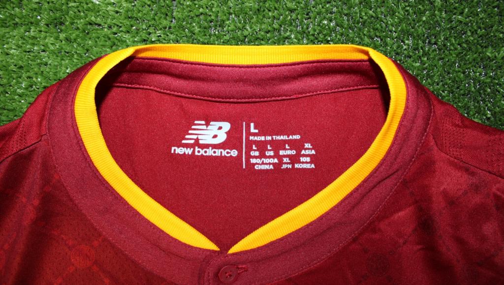 La maglia Home New Balance AS Roma 2022-23 presenta un sottile design a metà tra il rosso e il giallo.