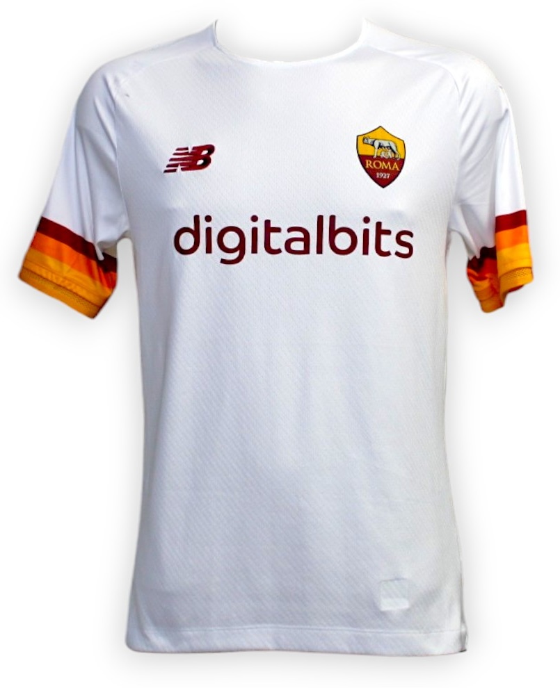 La maglia da trasferta New Balance Roma 2021-22 è prevalentemente bianca con rifiniture rosse, arancioni e gialle sui polsini e sulla parte superiore della schiena, ispirata all'iconico design del 1978-79.