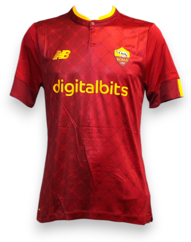 La maglia Home New Balance AS Roma 2022-23 presenta un sottile design a metà tra il rosso e il giallo.