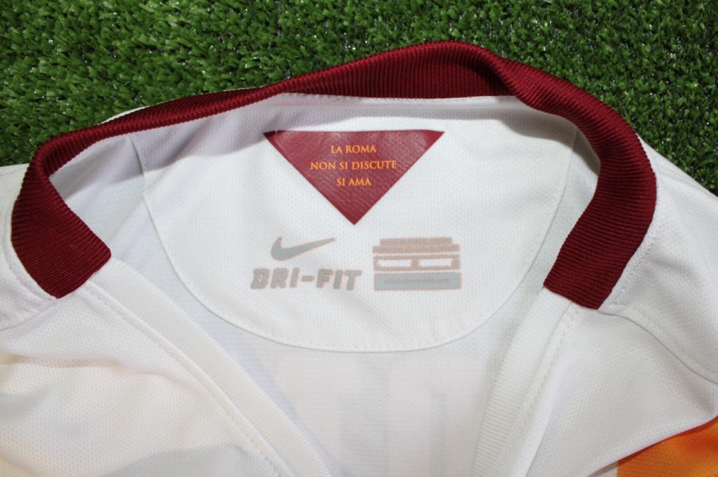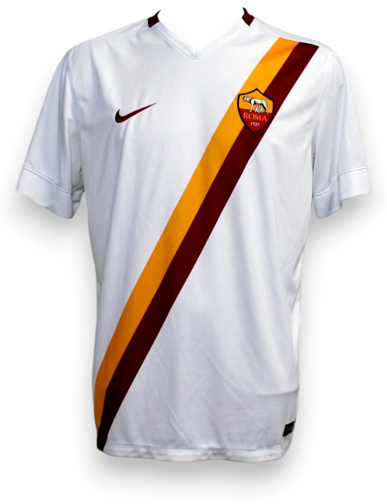 La maglia Nike da trasferta della Roma 2014-15 è bianca con dettagli rossi con un semplice colletto a V. L'elemento peculiare di questo kit Away è una fascia rosso-arancio che parte dalla spalla sinistra e arriva fino al fianco destro, ispirata al kit indossato negli anni Sessanta.
