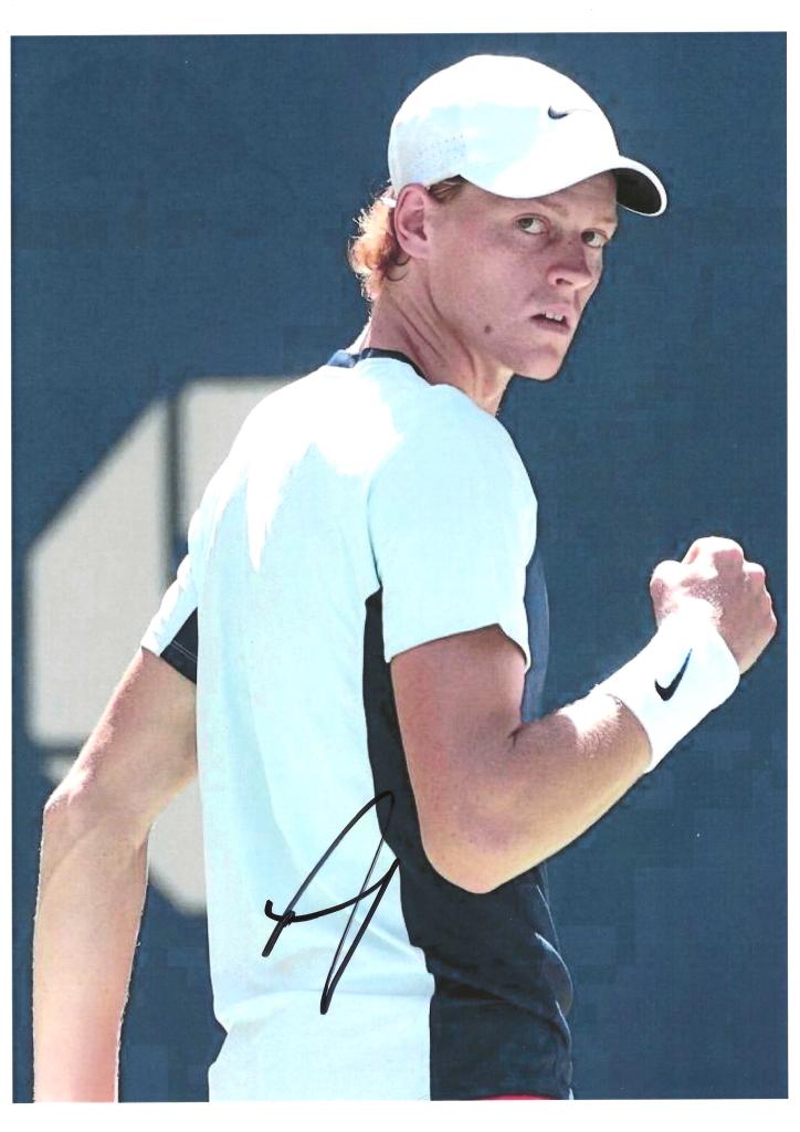 Fotografia di grandi dimensioni con autografo di Jannik Sinner celebre tennista italiano. Con la nazionale italiana ha conquistato la Coppa Davis nel 2023 e nel 2024.