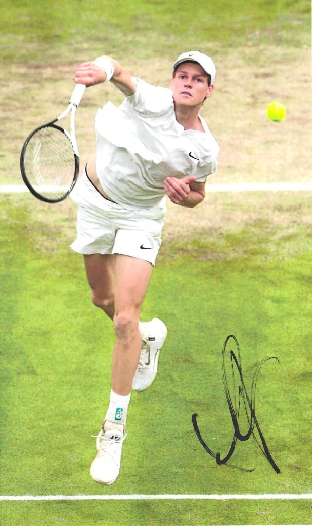 Fotografia di grandi dimensioni con autografo di Jannik Sinner celebre tennista italiano. Con la nazionale italiana ha conquistato la Coppa Davis nel 2023 e nel 2024.