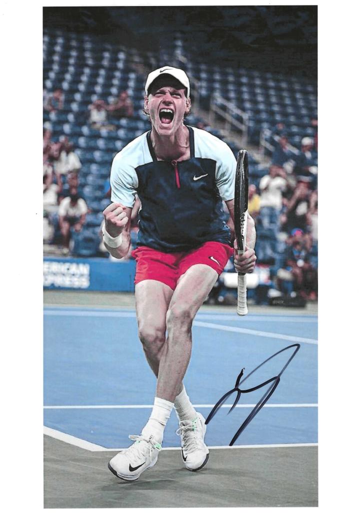 Fotografia di grandi dimensioni con autografo di Jannik Sinner celebre tennista italiano. Con la nazionale italiana ha conquistato la Coppa Davis nel 2023 e nel 2024.