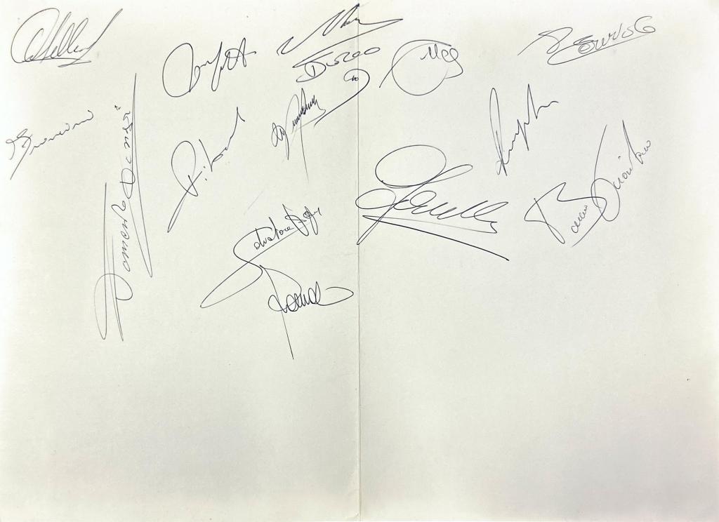Il seguente documento riporta i seguenti autografi: Luciano Castellini, Diego Armando Maradona, Careca, Salvatore Bagni, Fernando De Napoli, Giovanni Francini, Ciro Ferrara, Bruno Giordano, Giuseppe Bruscolotti, Francesco Romano e Andrea Carnevale.