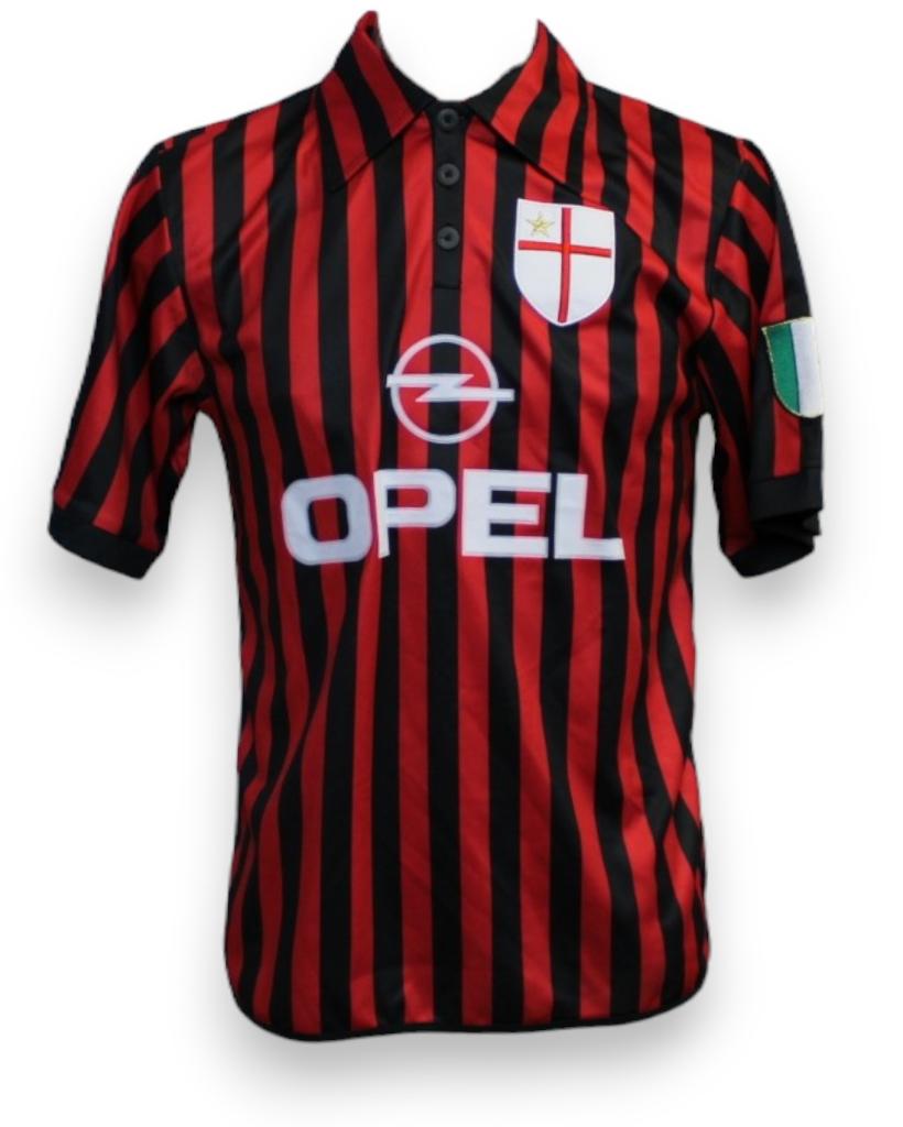 Celebrazione del centenario del club nel 1999. La maglia Home dell'AC Milan 1999-2000 presenta un look ispirato alla prima maglia del club nel 1899.