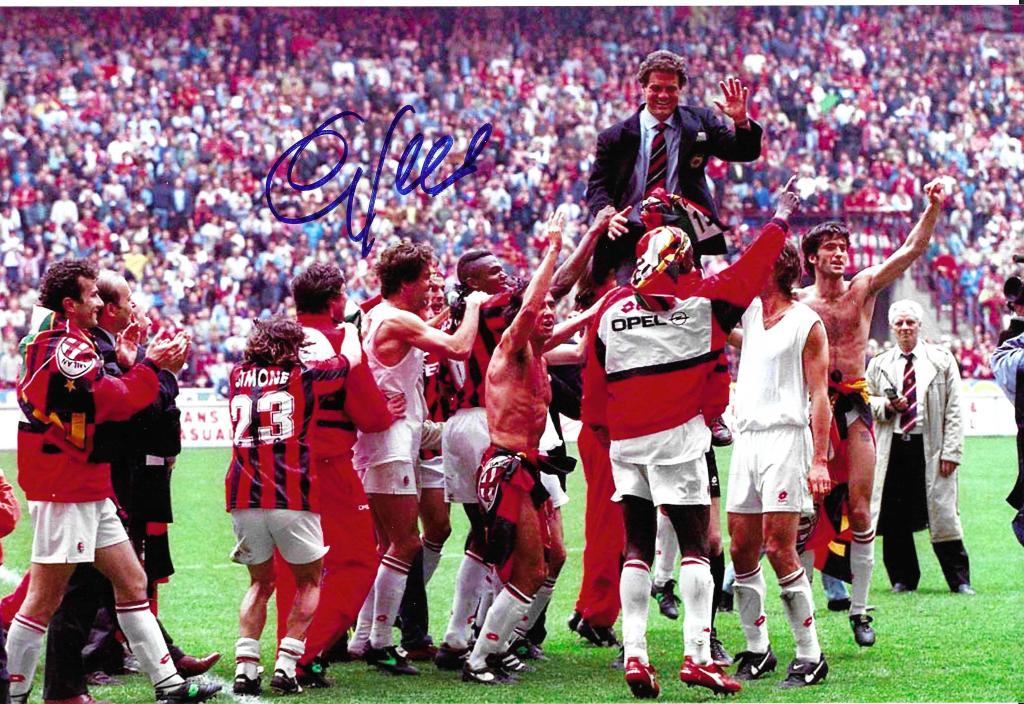 Fotografia autografata di Fabio Capello, immortalato nella storica celebrazione di un titolo con il Milan. Perfetta per tifosi del Milan.