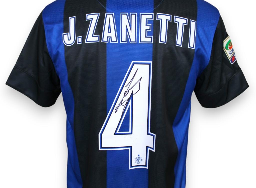 Sulla manica destra è applicata la patch della Serie A TIM. Il retro riporta il nome “J. ZANETTI” e il numero 4 con font ufficiale della stagione, e riporta l’autografo originale del capitano argentino, leggibile e firmato con pennarello nero.
