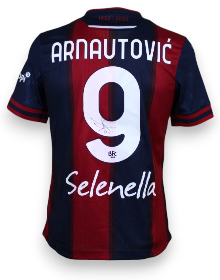 Maglia Bologna 2022-23 home, versione store con autografo di Arnautovic.