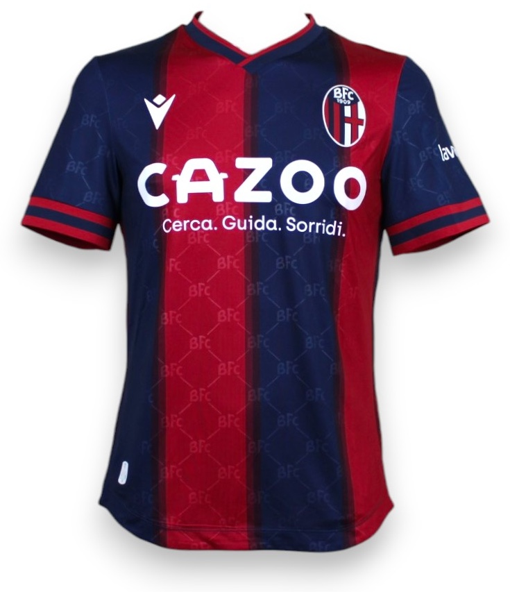 Maglia home del Bologna indossata nella stagione 2022-2023, versione store prodotta da Macron. Design classico a bande verticali rossoblù con pattern geometrico tono su tono e dettagli rossi su colletto e maniche. Sponsor tecnico Macron in bianco, main sponsor Cazoo e retro sponsor Selenella.