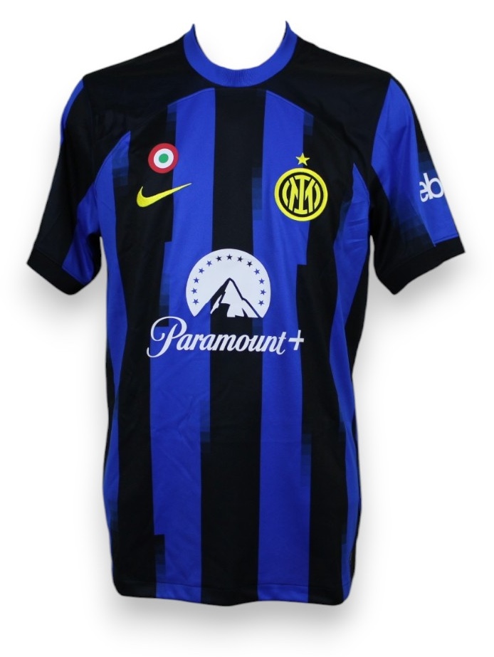 Presenta stemma societario gommato, swoosh giallo, sponsor Paramount+ e coccarda Coppa Italia. Patch UCL e UEFA Foundation applicate sulle maniche. Sul retro nome e numero di Nicolò Barella, con firma autografa.