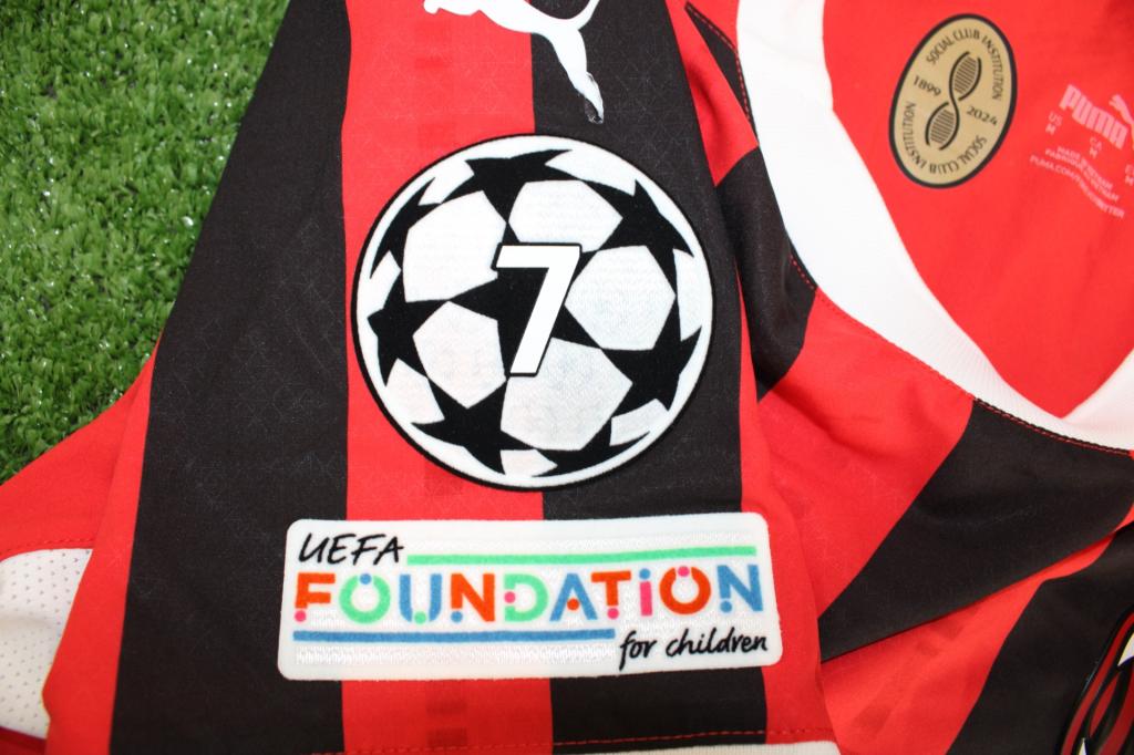 Sulla manica destra sono applicate le patch UEFA Foundation e Champions League. Sul retro compaiono il nome “Gimenez” e il numero 7, entrambi in bianco. Autografo originale di Santiago Gimenez in nero sul lato sinistro del dorso.