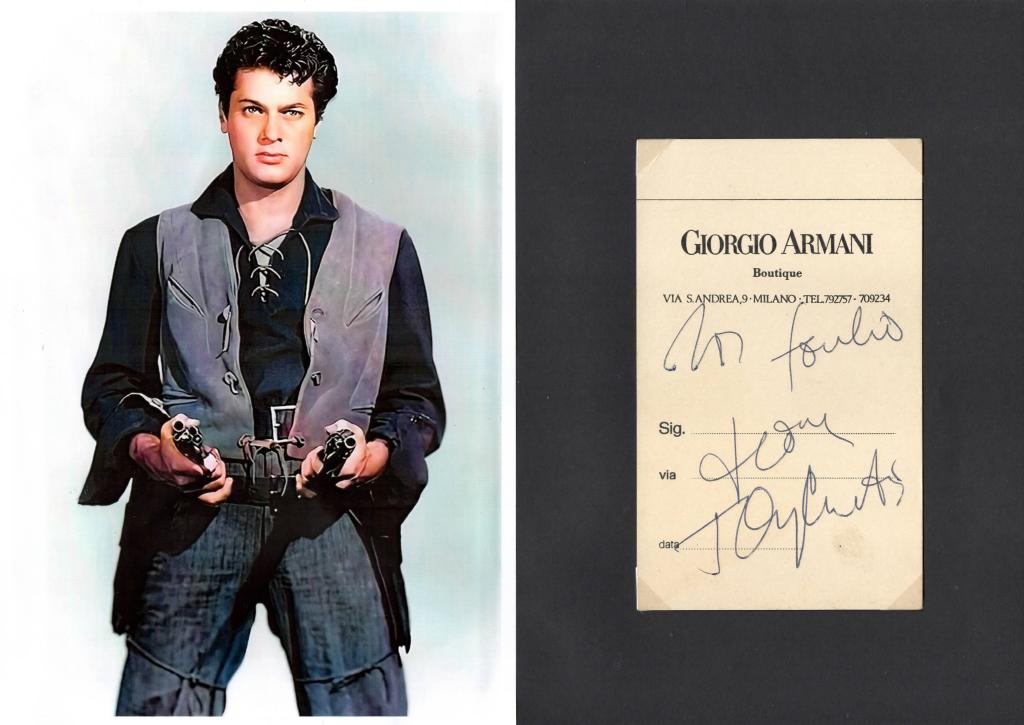 Autografo di Tony Curtis su biglietto intestato “Giorgio Armani” risalente agli anni ’80 con dedica “To Tullio”, montato su passe-partout con fotografia dell’attore, firmato sul fronte.