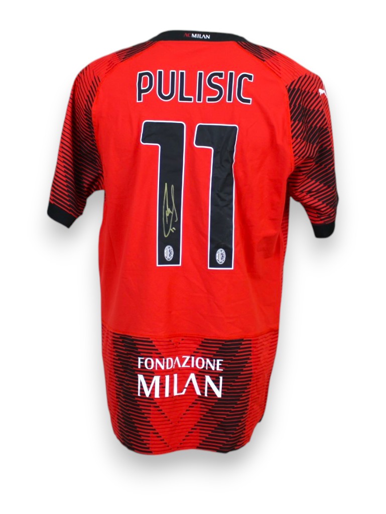 Sul retro sono presenti il nome e il numero 11 di Christian Pulisic, con autografo originale del calciatore in color oro direttamente sul numero. Il font è quello ufficiale utilizzato nelle competizioni nazionali. Presente anche la scritta “Fondazione Milan” in basso.