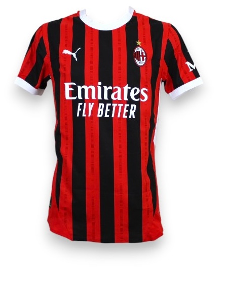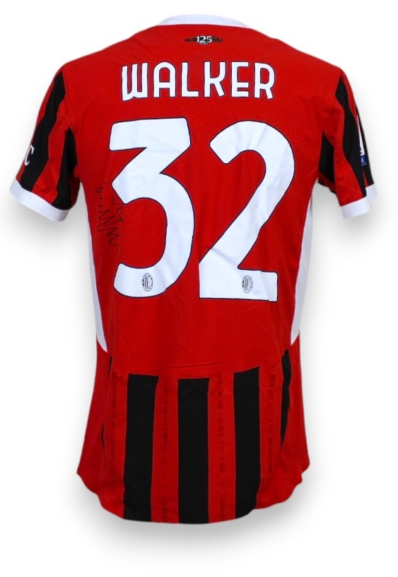 Maglia Milan 2024-25 home versione store, autografata da Walker. Con patch Serie A e dettagli celebrativi dei 125 anni del club.