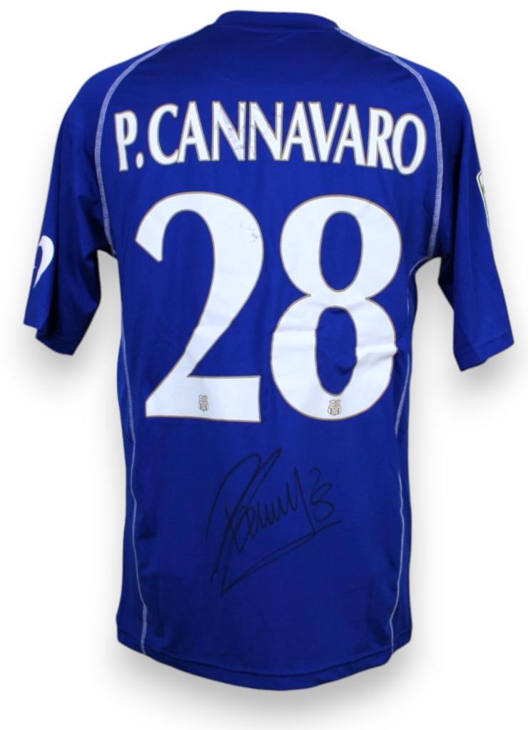 Presenta lo stemma del club sul petto, sponsor Mapei stampato e patch ufficiali Lega Serie A applicate su entrambe le maniche. Il retro riporta il nome "P. Cannavaro" e il numero 28, con autografo originale in nero nella parte bassa. La scritta interna al colletto e l’etichetta cucita "Made in Bulgaria" indicano una fornitura professionale.