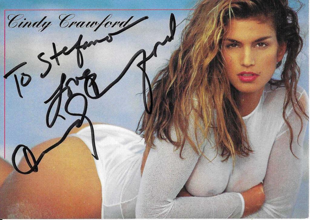 Fotografia autografata di Cindy Crawford, icona della moda degli anni '90, un pezzo unico per i collezionisti. Firmata e dedicata al fan.