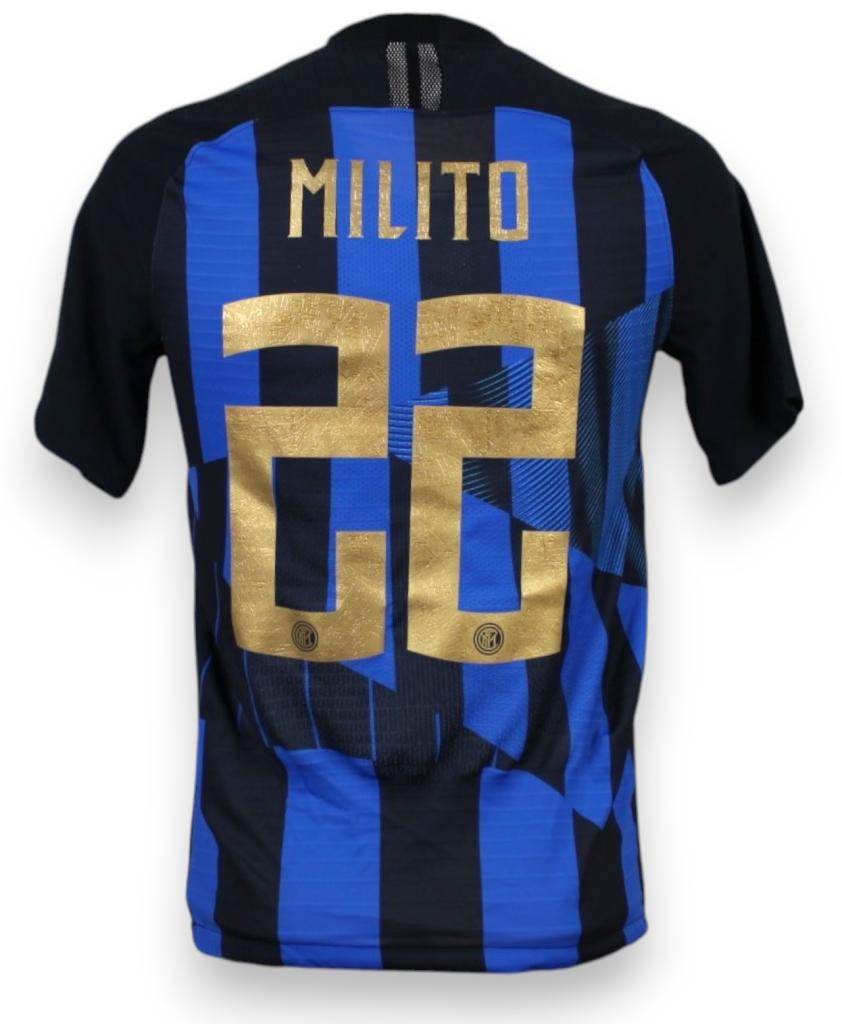 Maglia home ufficiale dell’Inter stagione 2018/19, versione store con personalizzazione “Milito 22". Realizzata da Nike, presenta un design moderno che reinterpreta le tradizionali strisce nerazzurre con inserti geometrici e dettagli in oro. Il logo Nike e lo sponsor Pirelli sono stampati in oro al centro, abbinati al nameset dorato sul retro.