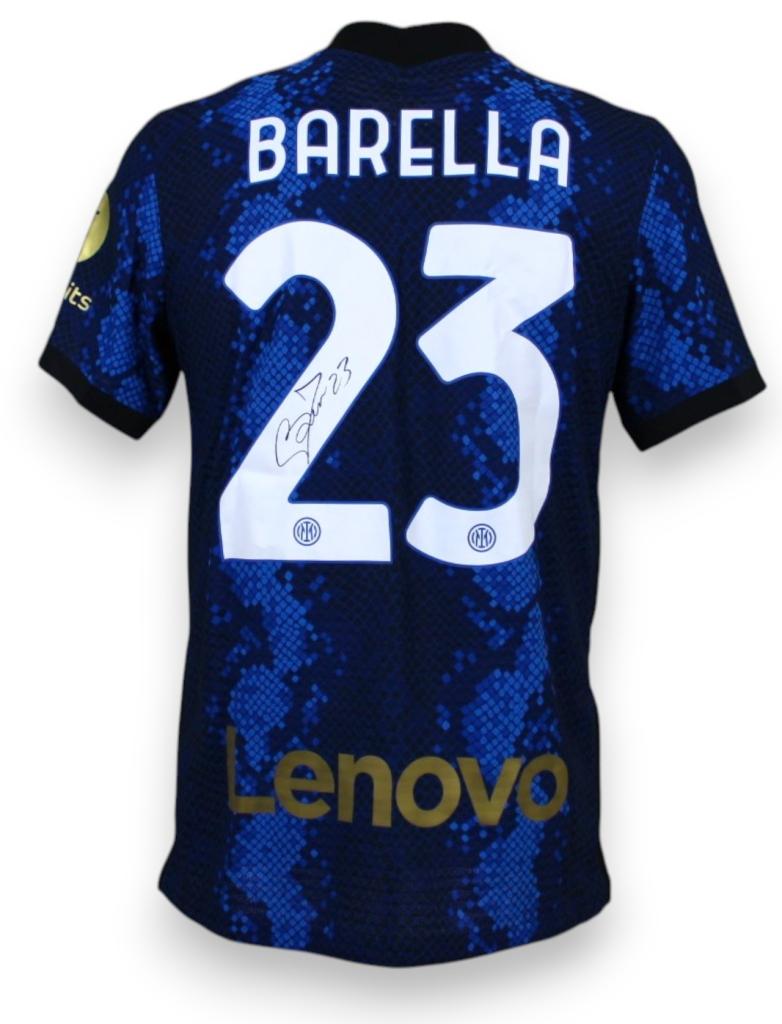 La maglia riporta patch ufficiale Serie A 2021-22 e il name set Barella 23. L'autografo è ben visibile in nero, apposto direttamente sul numero posteriore.