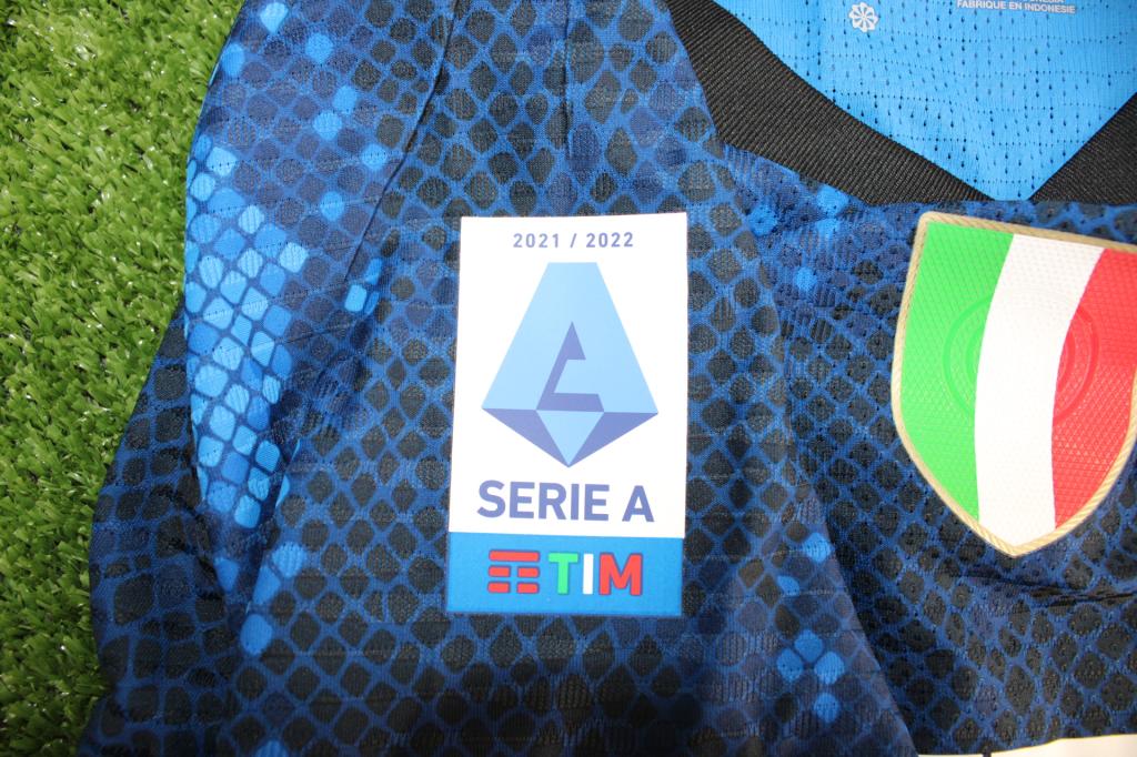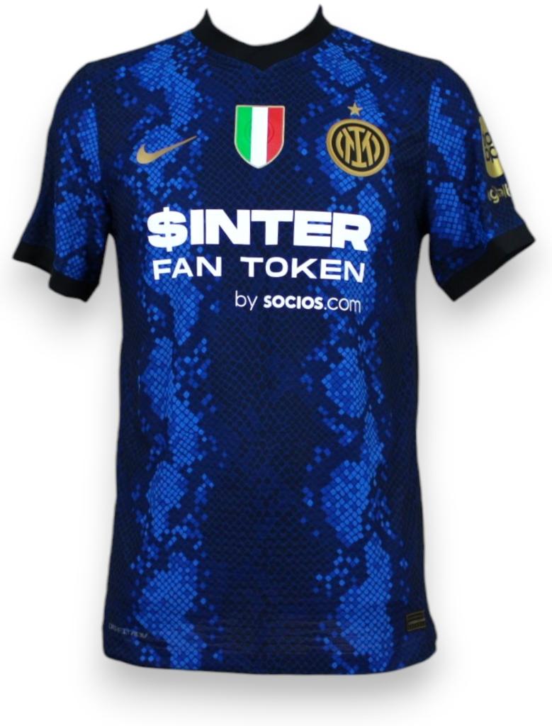 Maglia Inter 2021-22 store con patch Serie A e autografo Barella sul numero 23. Versione con trama “serpente” e sponsor $INTER.