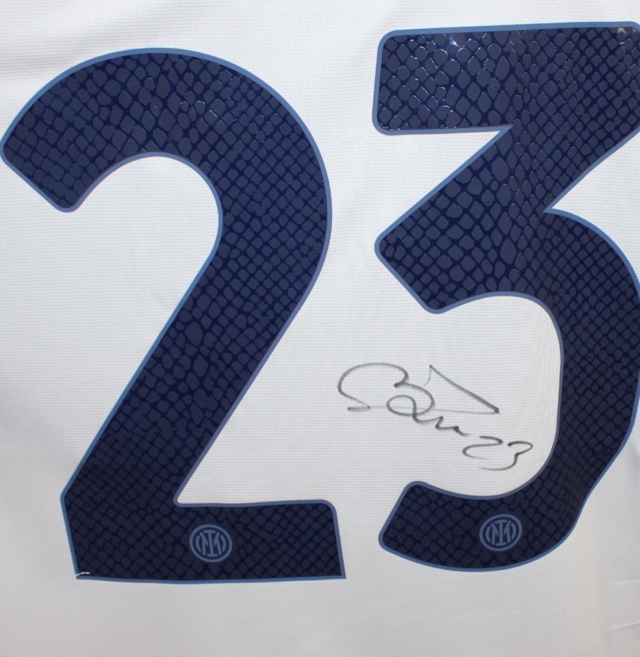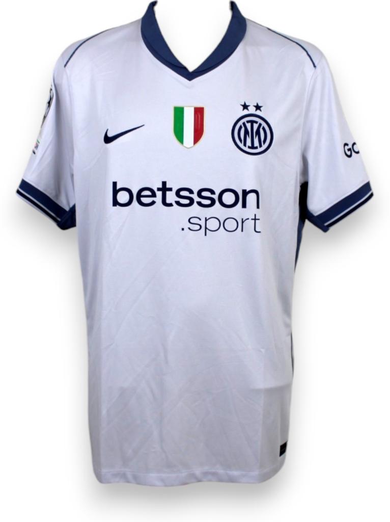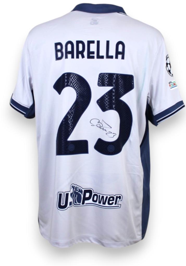 Maglia Inter away 2023-24 store autografata da Nicolò Barella, con patch Champions e Scudetto. Ideale per tifosi e collezionisti.