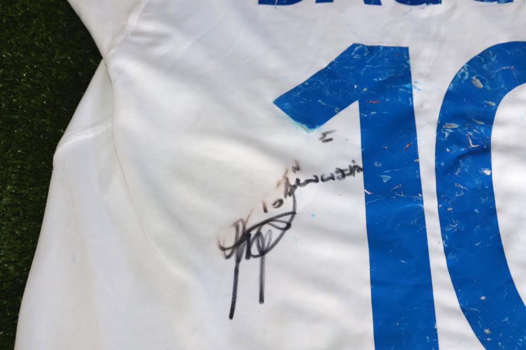 Sul retro è presente il nameset “Baggio 10”, numero iconico del fuoriclasse italiano. L’autografo è stato apposto con tratto nitido proprio sulla numerazione. La stagione 2003-04 fu l’ultima della carriera di Baggio,