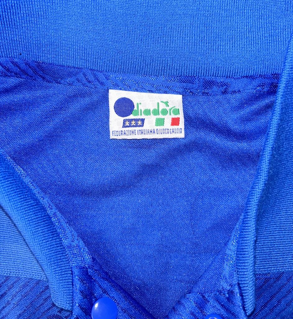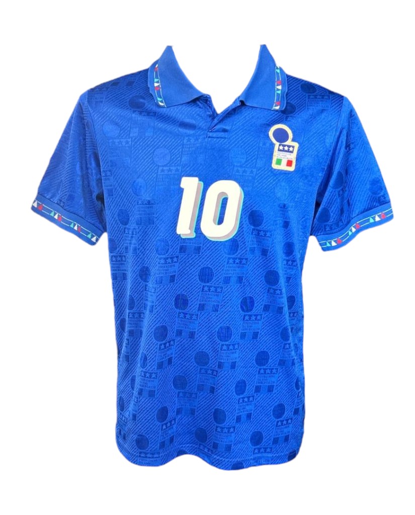 La maglietta riporta il vecchio logo della FIGC degli anni '90, presente il numero 10 sia sul retro che sul fronte della maglia.
