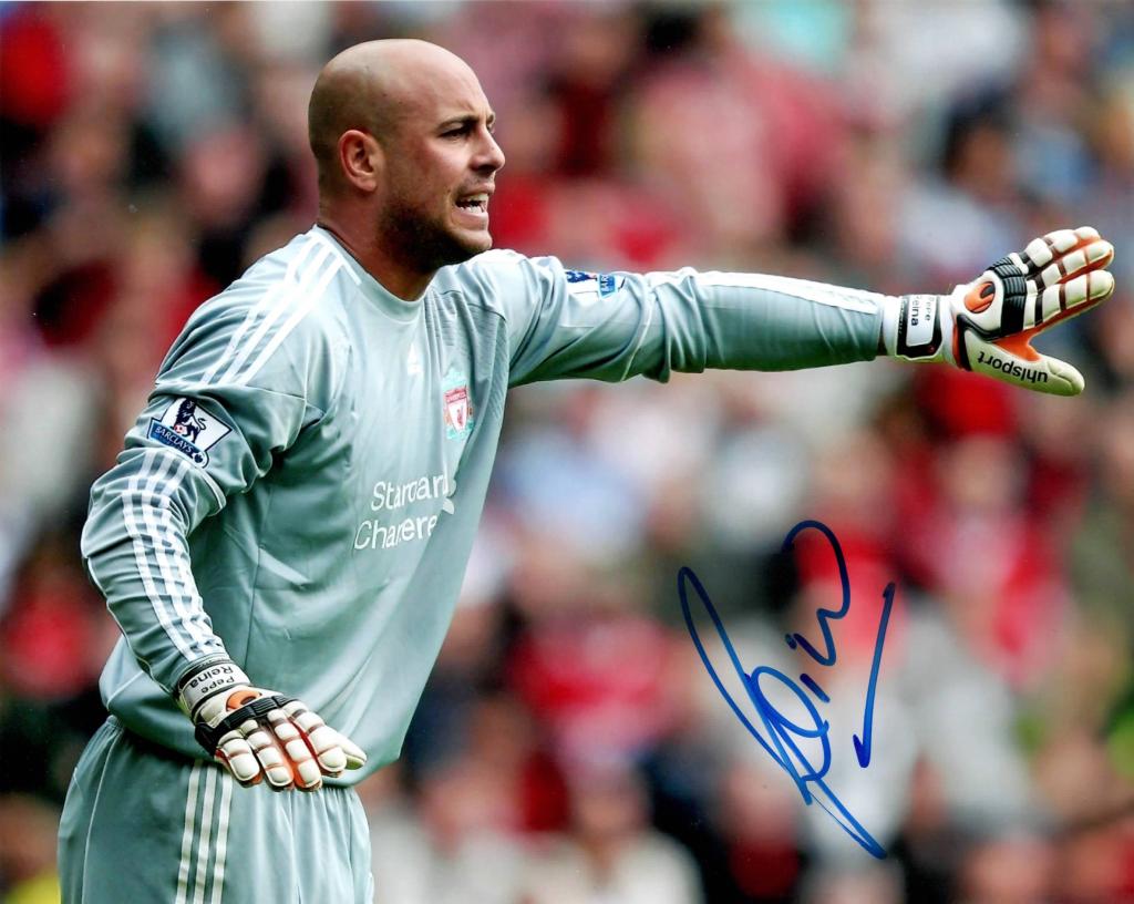 Fotografia autografata da Pepe Reina con il Liverpool, in posa durante una partita di Premier League.