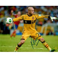 Autografo di Pepe Reina su fotografia a colori che lo ritrae in azione con la maglia del Liverpool durante una partita di Premier League mentre impartisce indicazioni ai compagni, firmata sul fronte.