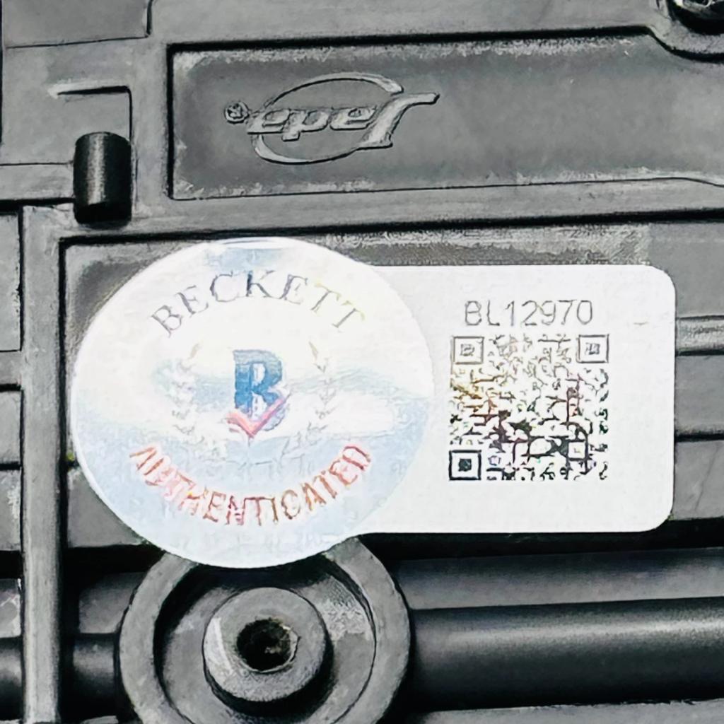 L’oggetto è certificato Beckett Authentication (codice BL12970), una delle principali realtà internazionali nel settore dell’autenticazione autografi. La scatola presenta alcuni segni di usura, ma il modellino e la firma risultano in ottime condizioni.