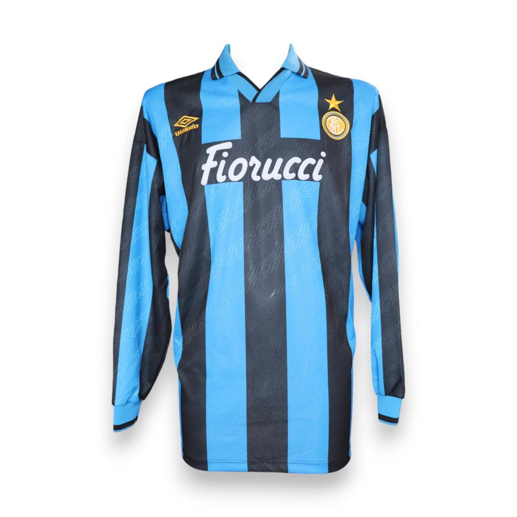 Prodotta da Umbro, presenta il tradizionale design a righe verticali nerazzurre con sponsor commerciale Fiorucci floccato al centro. Lo stemma del club è cucito sul petto, mentre il logo Umbro è ricamato. Questa stagione vide l’Inter consolidare il proprio organico in ambito nazionale ed europeo.