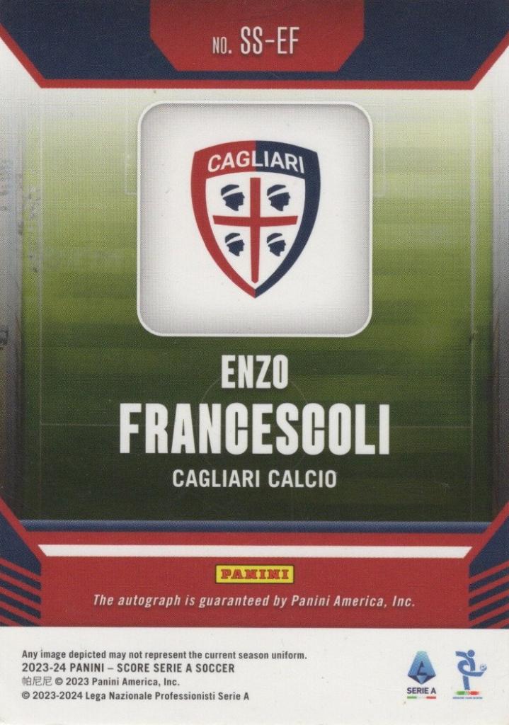 Autografo di Enzo Francescoli su card Panini Score che lo ritrae con la maglia del Cagliari nel layout ufficiale della collezione, con firma su etichetta applicata sul fronte.